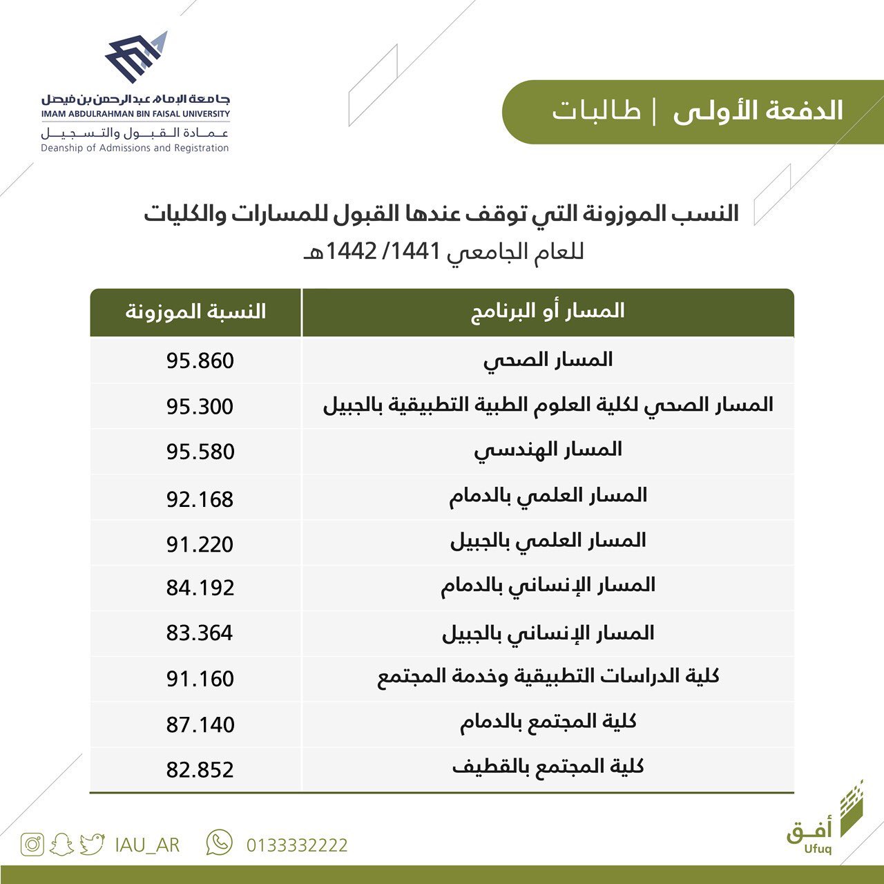 Jun 27, 2021 · جامعة طيبة. كانت النّسبة الموزونة 83.29% هي الحدّ الأدنى لقبول الطلّاب في هذا المسار في حين توقّف قبول الطالبات لهذا التخصّص عند النّسبة 88.98%. جامعة الطائف تأسست عام 2003 ومن أهم الجامعات في المملكة العربية السعودية حيث أنها تحتوي على 19 كلية تشمل جميع التخصصات العلمية والأدبية للبنين والبنات وتقع جامعة الطائف في منطقة الحورية في مدينة. جامعة الإمام عــبــدالرحـمن بن فيصل بوابة القبول حساب النسبة الموزونة لجامعة طيبة 1443 من الأمور الهامة التي يقوم بها الطلاب الراغبين في الالتحاق بالجامعة للتعرف على ما إن كان بإمكانهم الالتحاق بجامعة طيبة أو لا، وذلك لأن كل جامعة من الجامعات السعودية تقوم بتخصيص.
